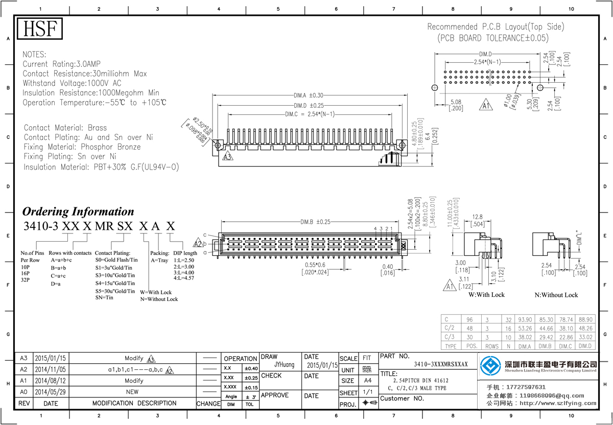 產(chǎn)品分類:DIN 41612連接器 產(chǎn)品型號(hào):聯(lián)豐盈 2.54間距 3*16P 90度 彎插型 公座 DIN41612 板對(duì)板 連接器 技術(shù)參數(shù):額定電流:3.0amp電流電阻:30m最大耐壓:1000V的交流/直流絕緣電阻:1000分鐘