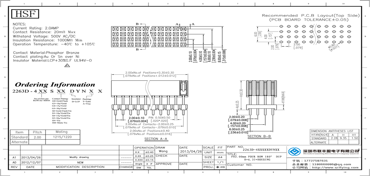 技術參數:額定電流:2.0amp電流電阻:20mΩ最大絕緣電阻:1000mΩ承受電壓:AC 500V /分鐘工作溫度:40﹣℃+ 105℃接觸材料:磷青銅接觸電鍍:對鎳金絕緣體材料:聚酯(UL94V-0)標準:PA6T或PBT黑色+ 30% GF