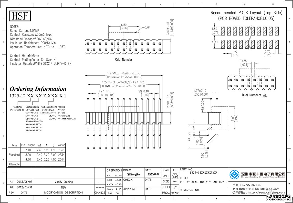 產品分類:排針連接器 產品規格:聯豐盈 1.27MM 單層雙排 90貼片式(Type A) 排針 產品介紹:額定電流:1.0amp電流電阻:20m最大絕緣電阻:1000m民承受電壓:AC 500V /分鐘工作溫度:40﹣℃+