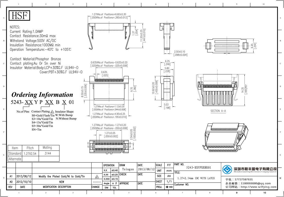 產品分類:IDC插座連接器 產品型號:1.27*2.54 TYCO 彈片型 IDC 聯豐盈 供應 技術參數:額定電流:1.0amp電流電阻:20m最大絕緣電阻:1000mmin耐壓:1000V AC /分鐘工作溫度:40﹣℃+ 105℃接觸材