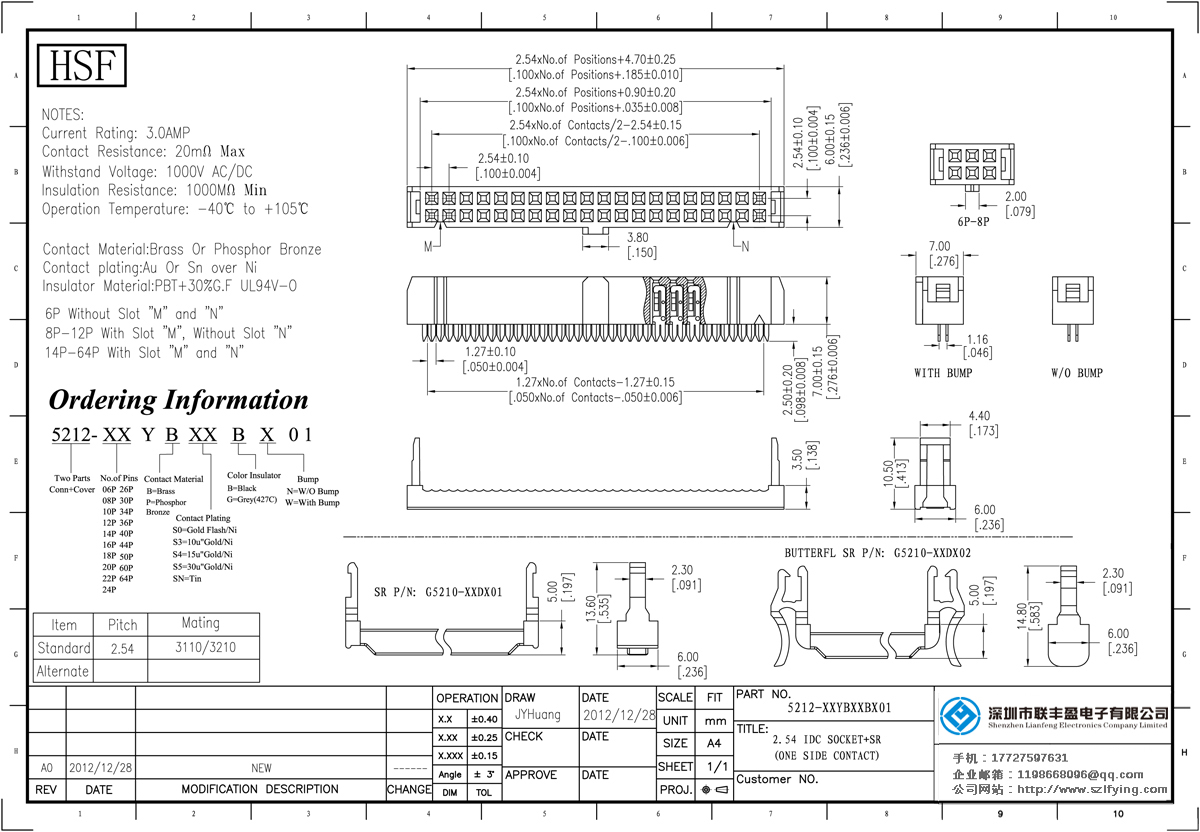 產品分類:IDC插座連接器 產品型號:2.54 彈片型 磷銅 帶凸點 IDC 聯豐盈 技術參數:額定電流:3.0amp電流電阻:20m最大絕緣電阻:1000mmin耐壓:1000V AC /分鐘工作溫度:40﹣℃+ 105℃接觸材