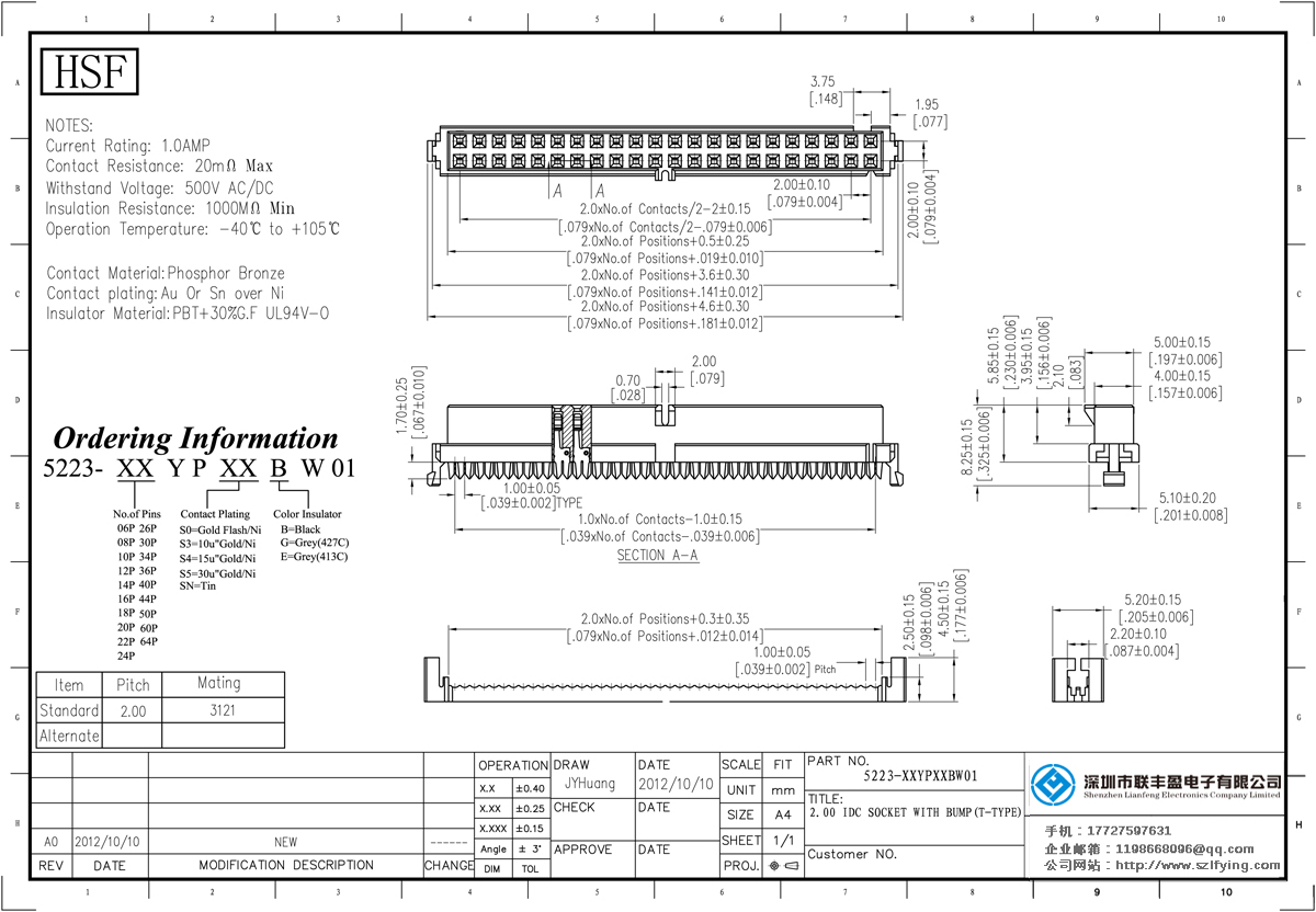 產品分類:IDC插座連接器 產品型號:UL認證 IDC插座連接器 聯豐盈供應 技術參數:額定電流:1.0amp電流電阻:20m最大絕緣電阻:1000mmin耐壓:1000V AC /分鐘工作溫度:40﹣℃+ 105℃接觸材料