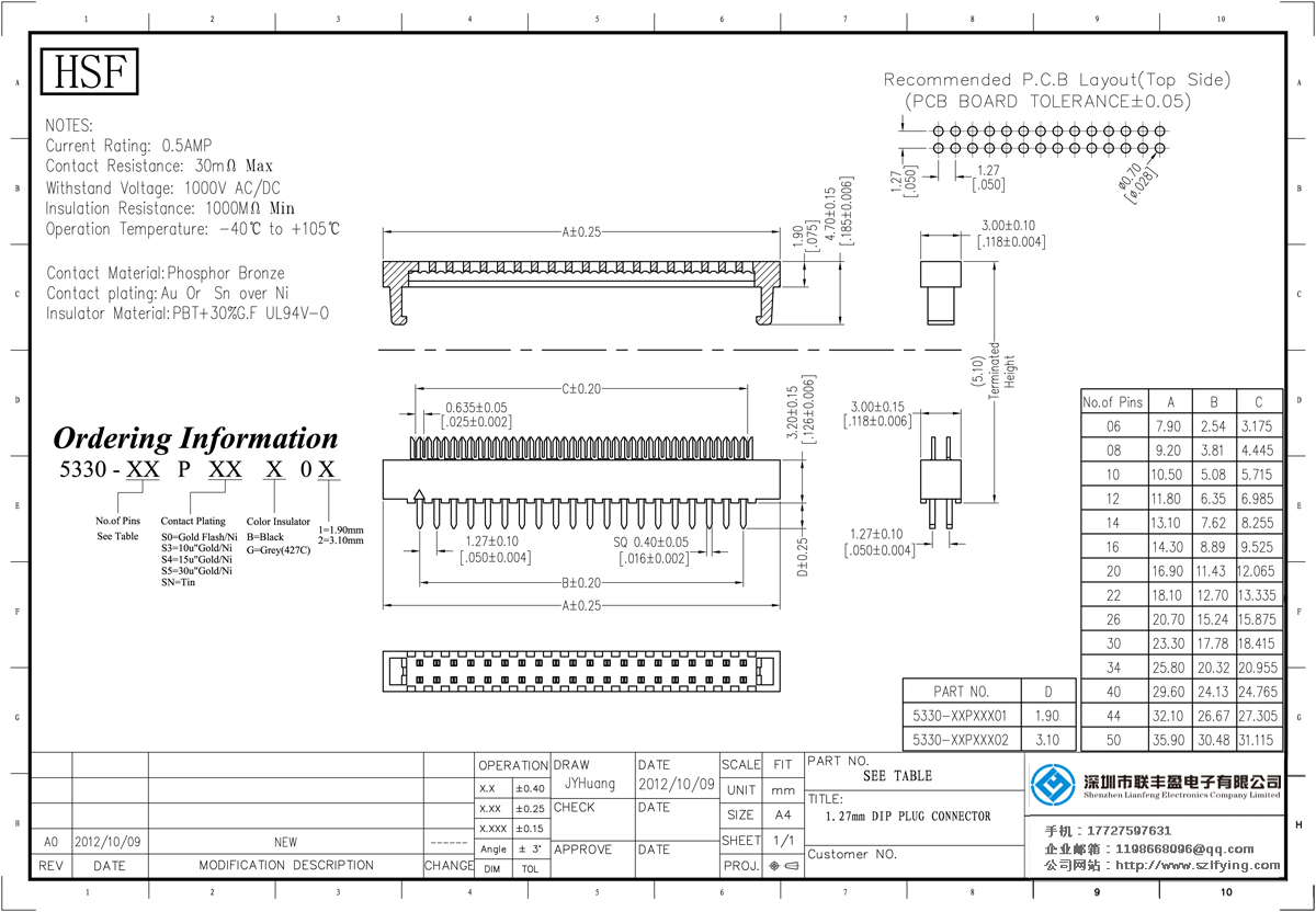產品分類: DIP插頭連接器 產品型號:1.27MM 磷銅 DIP PLUG 連接器 聯豐盈 技術參數:額定電流:3.0amp電流電阻:30m最大絕緣電阻:1000mmin耐壓:500V的交流/直流操作溫度:40﹣℃+ 105℃接觸