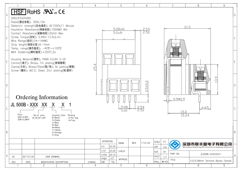 產品分類:接線端子 產品型號:PCB接線端子 間距5.00/5.08mm 詳細型號:螺釘式PCB接線端子-JL500B,間距5.00/5.08mm,CE認證,UL證書 產品介紹:材質電鍍(MATERIAL) , 螺絲(Screw)M2.0,鋼,鍍鋅