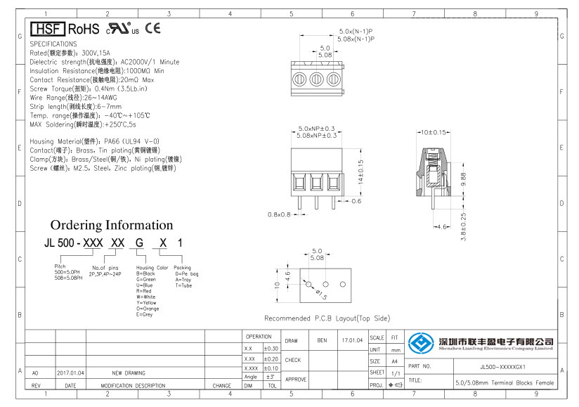 詳細型號:螺釘式PCB接線端子-JL500,間距5.00/5.08mm,CE認證,UL證書