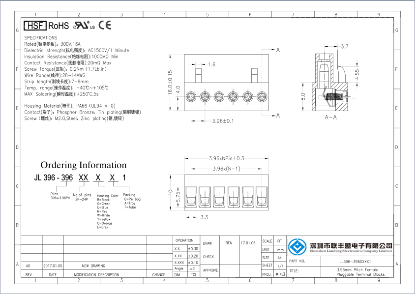 詳細型號:插拔式接線端子-JL396,間距3.96mm,CE認證,UL證書