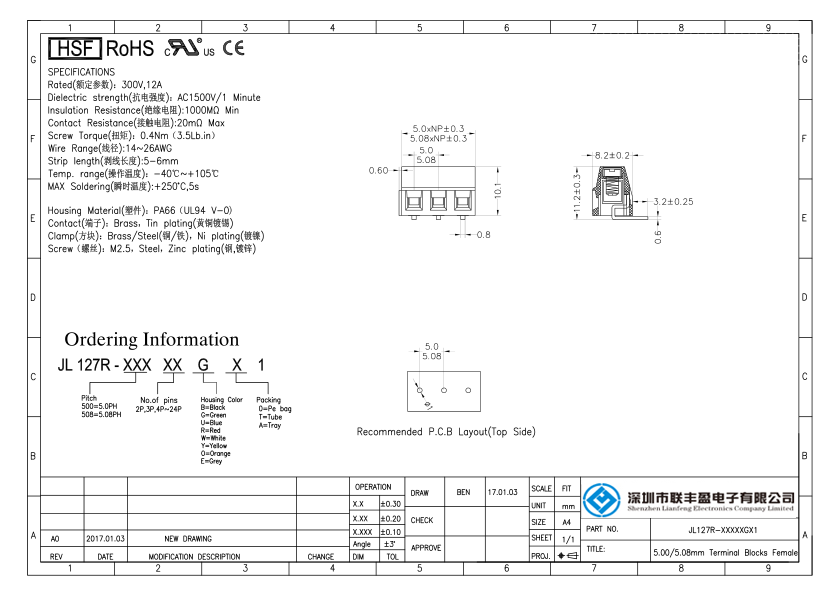 產品分類:接線端子 產品型號:螺釘式PCB接線端子-127R,間距5.00/5.08mm, 產品介紹:材質電鍍(MATERIAL) , 螺絲(Screw)M2.0,鋼,鍍鋅Steel,Zinc Plated 彈片(Reed)黃銅,鍍鎳Brass,Ni plat