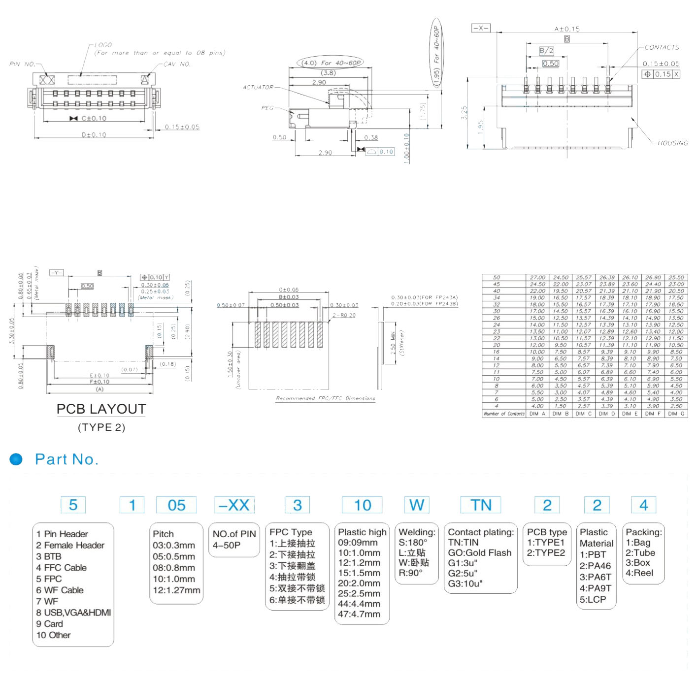 產品類型 FPC0.5-XP間距 0.5mm H1.0 后翻