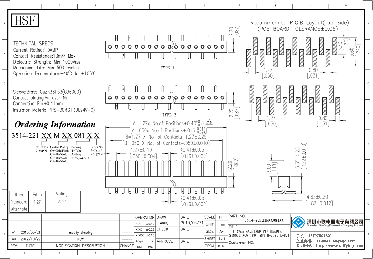 產品分類:圓孔排針排母連接器 產品型號:聯豐盈 1.27MM H=2.2 180 SMT 圓型排針 廠家 技術參數:額定電流:1.0amp接觸電阻:10m0 Max Dielectric強度:MIN 500vrm5機械壽命:最少500次交配銷:0.38