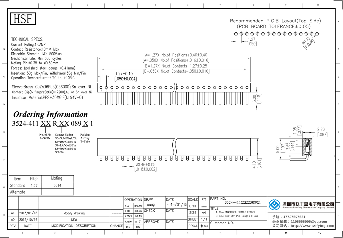產(chǎn)品分類:圓孔排針排母連接器 產(chǎn)品型號:1.27MM 單排 4爪型 圓孔排母 批發(fā) 廠家 技術(shù)參數(shù):額定電流:1.0amp接觸電阻:10m0 Max Dielectric強度:MIN 500vrm5機械壽命:最少500次交配銷:0.380.