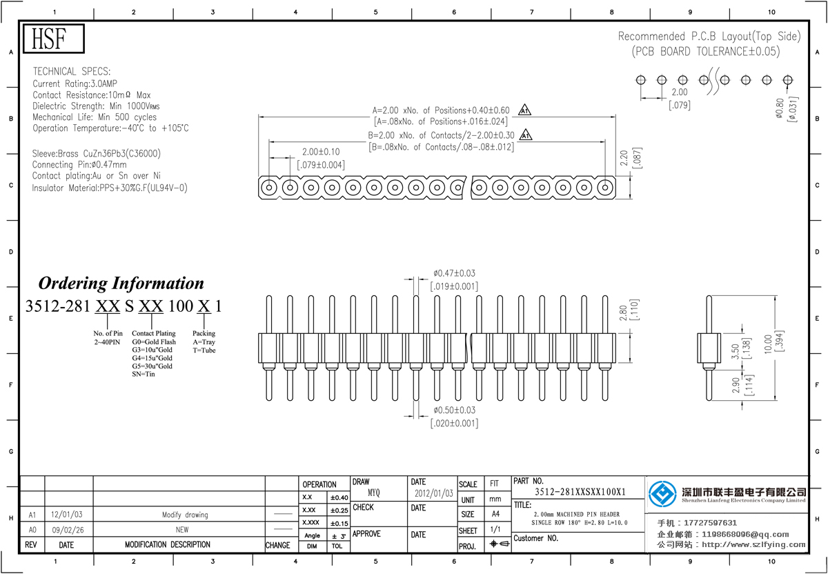 產(chǎn)品分類:圓孔排針排母連接器 產(chǎn)品型號:聯(lián)豐盈 2.0MM 單排 H=2.8 S/T 圓型排針 技術(shù)參數(shù):額定電流:3.oamp接觸電阻:1om最大介電強(qiáng)度:MIN 1000vrms機(jī)械壽命:最少500次交配引腳:0.400.66m