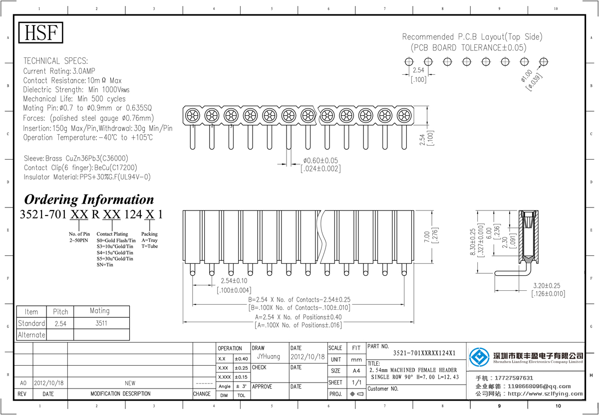 技術參數:額定電流:3.oamp接觸電阻:1omΩ最大介電強度:MIN/1000vrms機械壽命:最少500次交配φ引腳:0.7φ0.9mm或0.635sq力量:(拋光不銹鋼表φ0.76mm)插入:150g最大/銷,退出:30g分鐘/銷操作溫度:40℃+ 105℃套:黃銅cuzn36pb3(c36000)接觸CIIP(6指):BeCu(C17200)絕緣材料:聚苯硫醚+ 30%