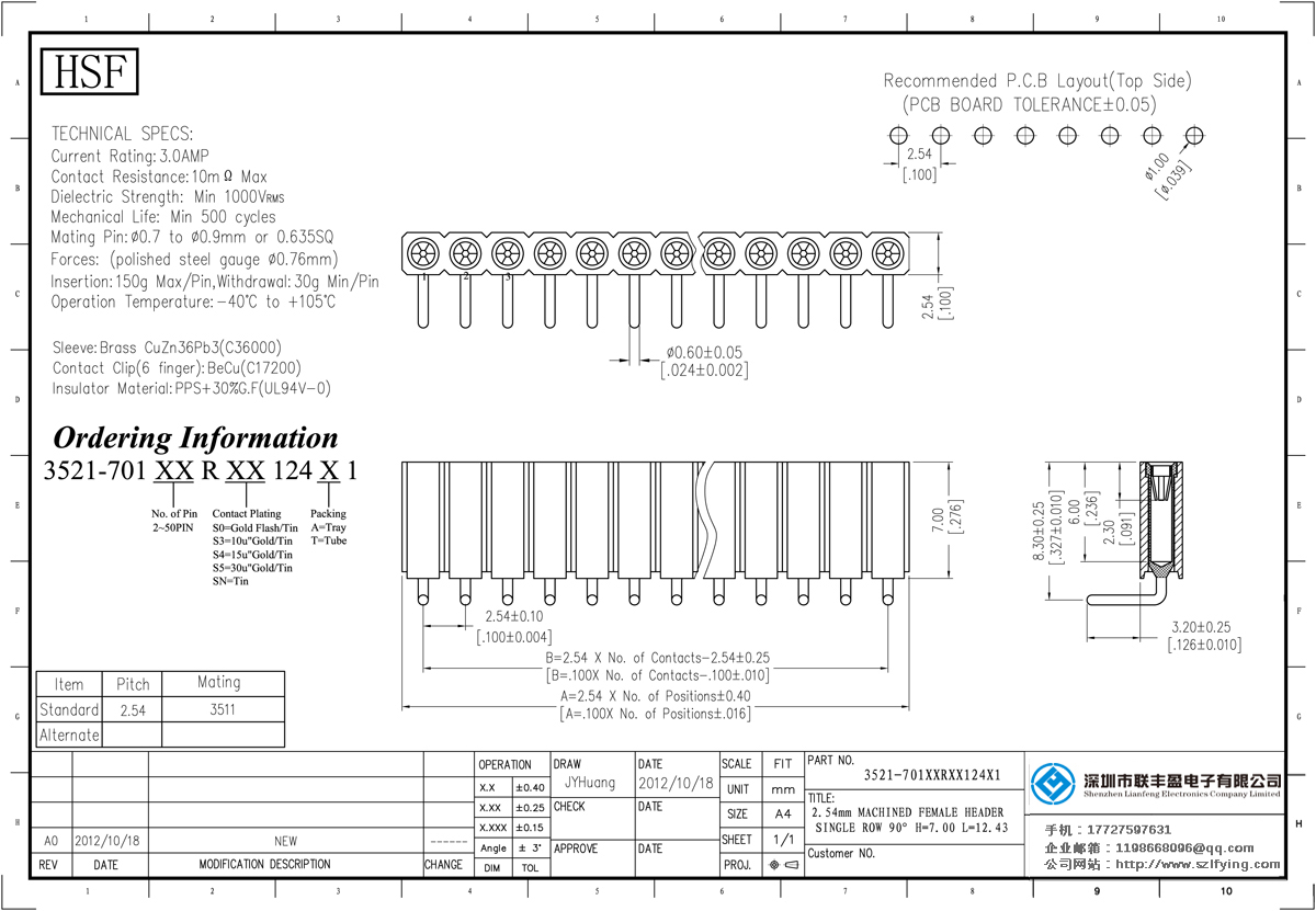 產(chǎn)品分類:圓孔排針排母連接器 產(chǎn)品型號:聯(lián)豐盈 2.54MM 單排 H=7.0 90度彎插 圓孔排母 技術(shù)參數(shù):額定電流:3.oamp接觸電阻:1om最大介電強(qiáng)度:MIN 1000vrms機(jī)械壽命:最少500次交配引腳: