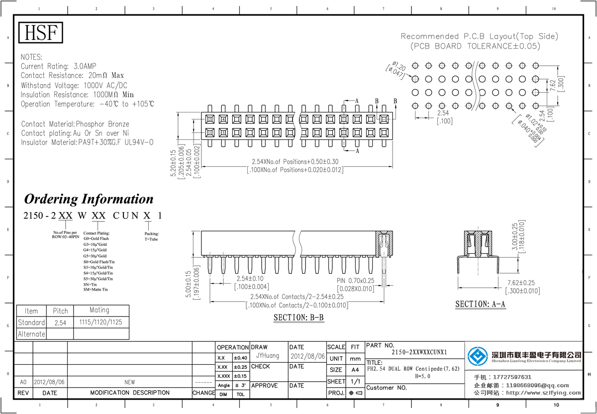 產(chǎn)品分類:排母連接器 產(chǎn)品規(guī)格:聯(lián)豐盈 2.54MM 雙排 蜈蚣腳 排母 供應(yīng) 產(chǎn)品介紹:額定電流:3.0amp電流電阻:20m最大絕緣電阻:1000mmin耐壓:1000V AC /分鐘工作溫度:40﹣℃+ 105℃接觸材