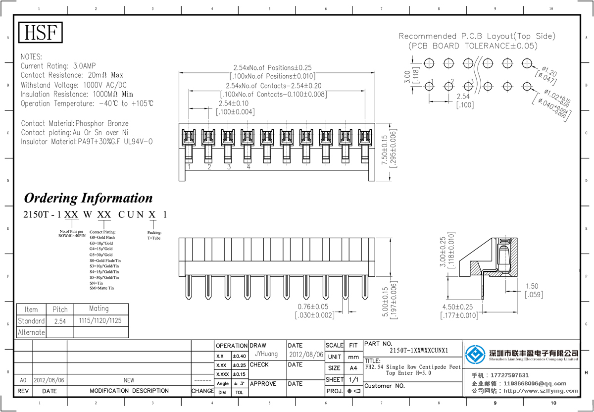 產(chǎn)品分類:排母連接器 產(chǎn)品規(guī)格:聯(lián)豐盈 耐高溫 2.54MM H=5.0MM 上插式 單排 排母 產(chǎn)品介紹:額定電流:3.0amp電流電阻:20m最大絕緣電阻:1000mmin耐壓:1000V AC /分鐘工作溫度:40﹣℃+ 10