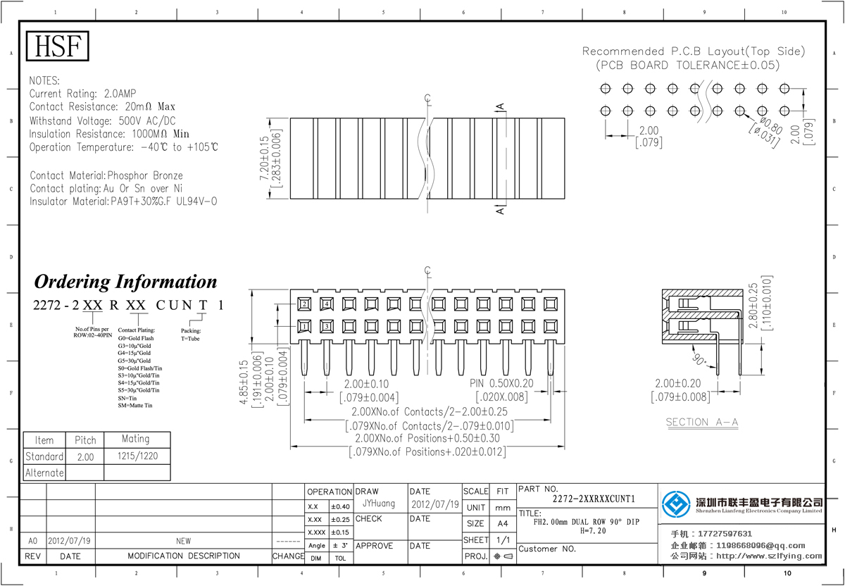 產(chǎn)品分類:排母連接器 產(chǎn)品規(guī)格:聯(lián)豐盈 2.0 排母 90度彎針 PA9T料黑色 B型 H=7.2 連接器 供應(yīng)商 產(chǎn)品介紹:額定電流:2.0amp電流電阻:20m最大絕緣電阻:1000m民承受電壓:AC 500V /分鐘工作