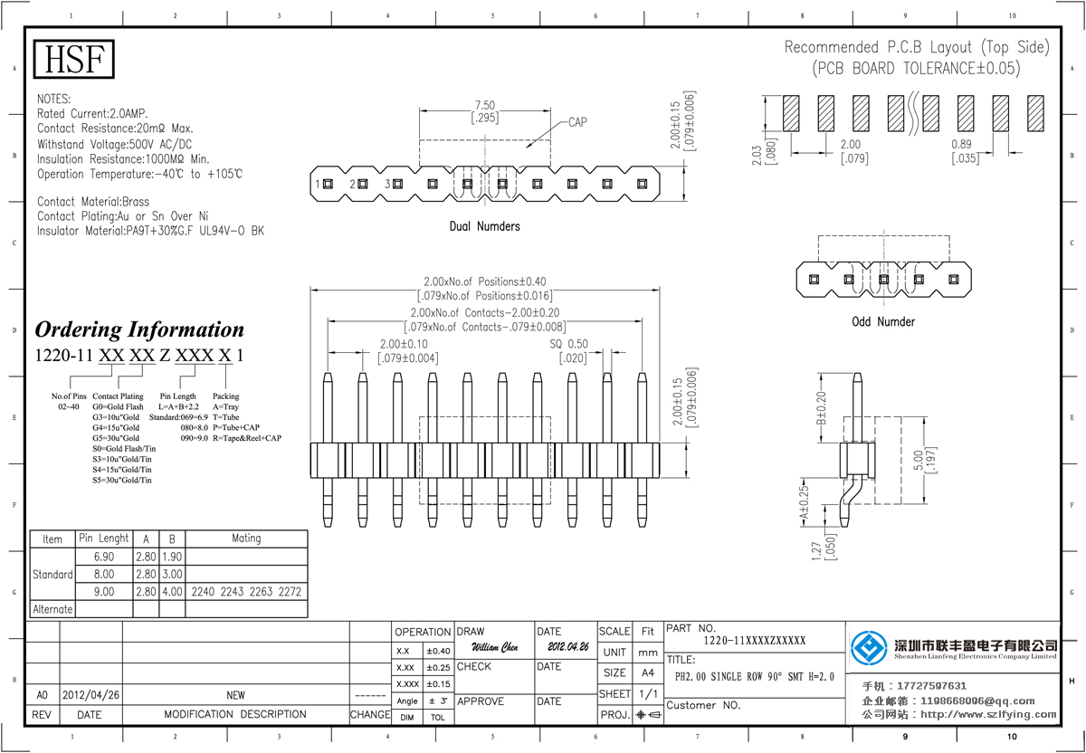 產品分類:排針連接器 產品規格:聯豐盈 2.0MM 單排 90SMT(Type A) 排針 生產 產品介紹:額定電流:2.0amp電流電阻:20m最大絕緣電阻:1000m民承受電壓:AC 500V /分鐘工作溫度:40﹣℃+ 105℃接