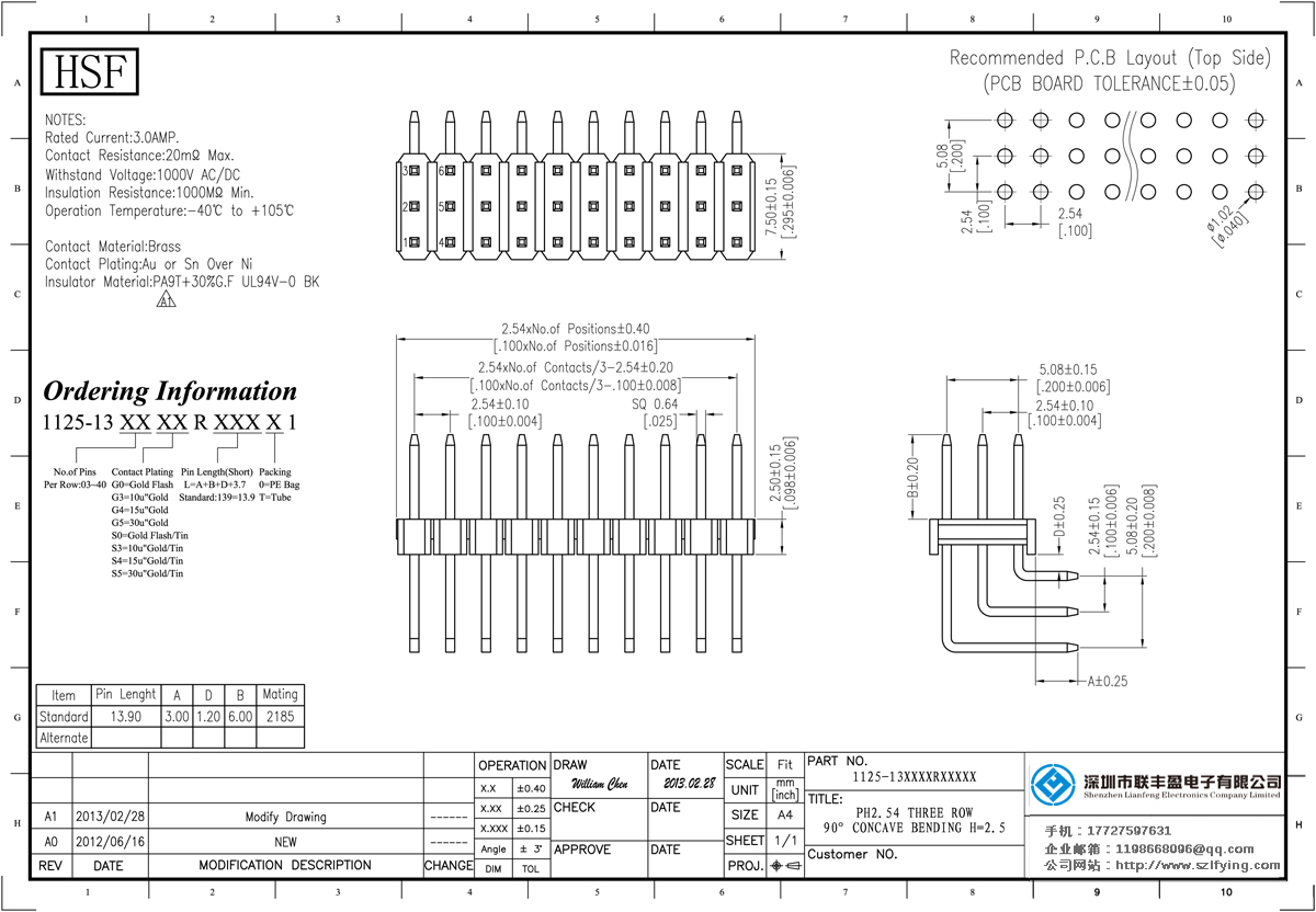 產品介紹:額定電流:3.0amp電流電阻:20mΩ最大絕緣電阻:1000mΩ民承受電壓:AC 500V /分鐘工作溫度:40﹣℃+ 105℃接觸材料:黃銅觸點電鍍金或錫鎳絕緣體材質:聚酯(UL94V-0)標準:PA9T或PBT黑色+ 30% GF