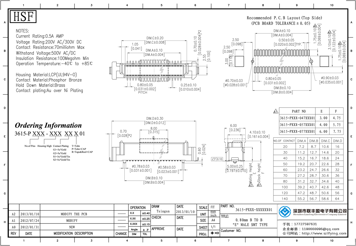 技術參數:額定電流:0.5amp電流電阻:65mΩ最大絕緣電阻:1000mΩ承受電壓:交流250V /分鐘工作溫度:40﹣℃+ 105℃接觸材料:磷青銅觸點電鍍金或錫鎳絕緣體材質:聚酯(UL94V-0)標準:LCP + 30% GF