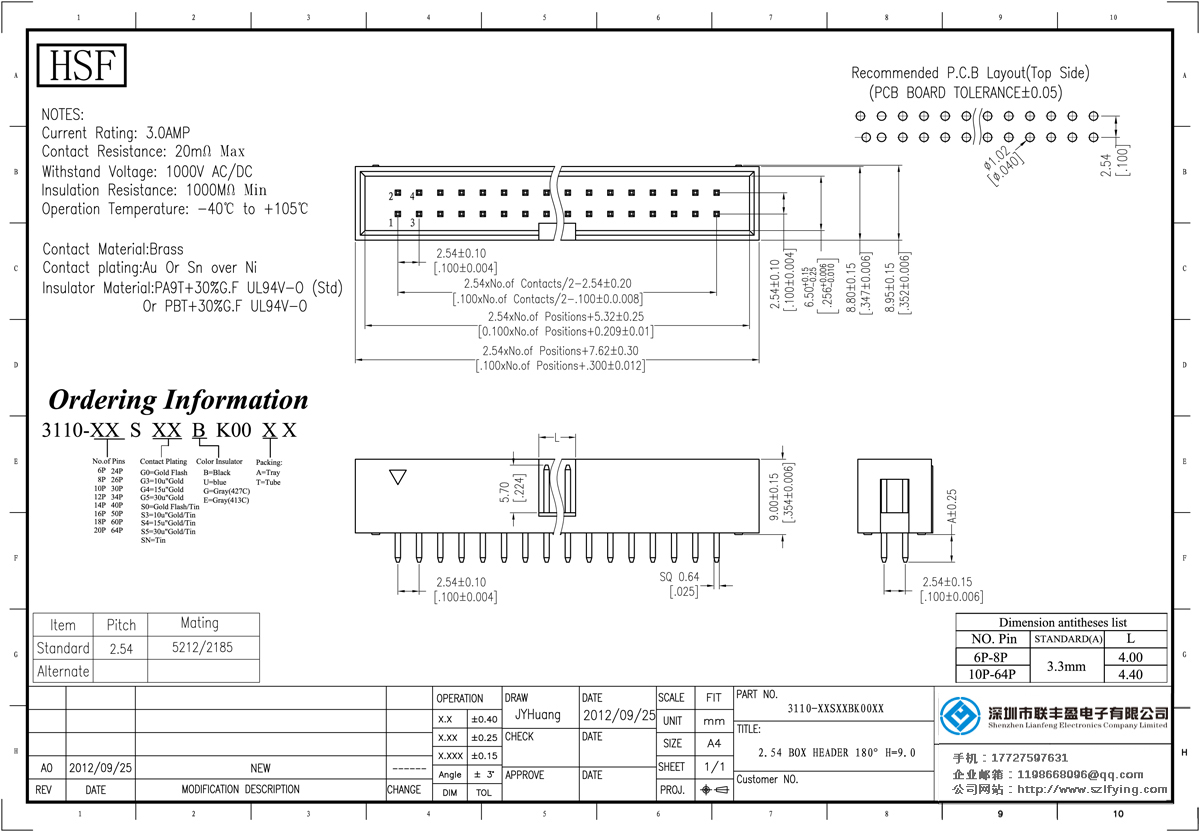 產品分類: 簡易牛角連接器 產品型號: 聯豐盈 2.54MM 散鍍全金 滿PIN 180DIP 簡牛 技術參數:額定電流:1.52amp電流電阻:20m最大承受電壓:500V的交流/直流絕緣電阻:1000分鐘操作溫度: